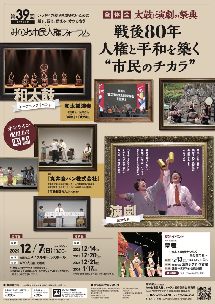 第39回「みのお市民人権フォーラム」は、統一テーマ「いっさいの差別を許さないために、話す、語る、伝える、分かち合う」に「戦後80年人権と平和を築く“市民のチカラ”」を加え、本年の全体テーマといたしました。